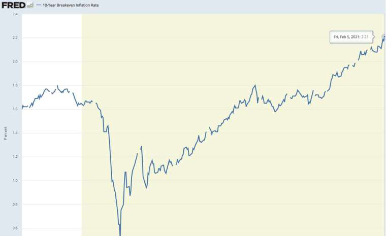 5日,10年期美债平衡通货膨胀率已达到2.21%,是2018年中以来的最高水平。平衡通货膨胀率,是国债与抗通货膨胀债券(TIPS) 的利率差,是市场预期通货膨胀率的重要指标。