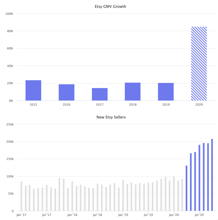 根据 marketplace pulse 提供的数据,2020 年 Etsy 的 GMV 将同比增长 80%~90%,同时,今年 Etsy 上的卖家数量预计将会增加超过 100 万的卖家。