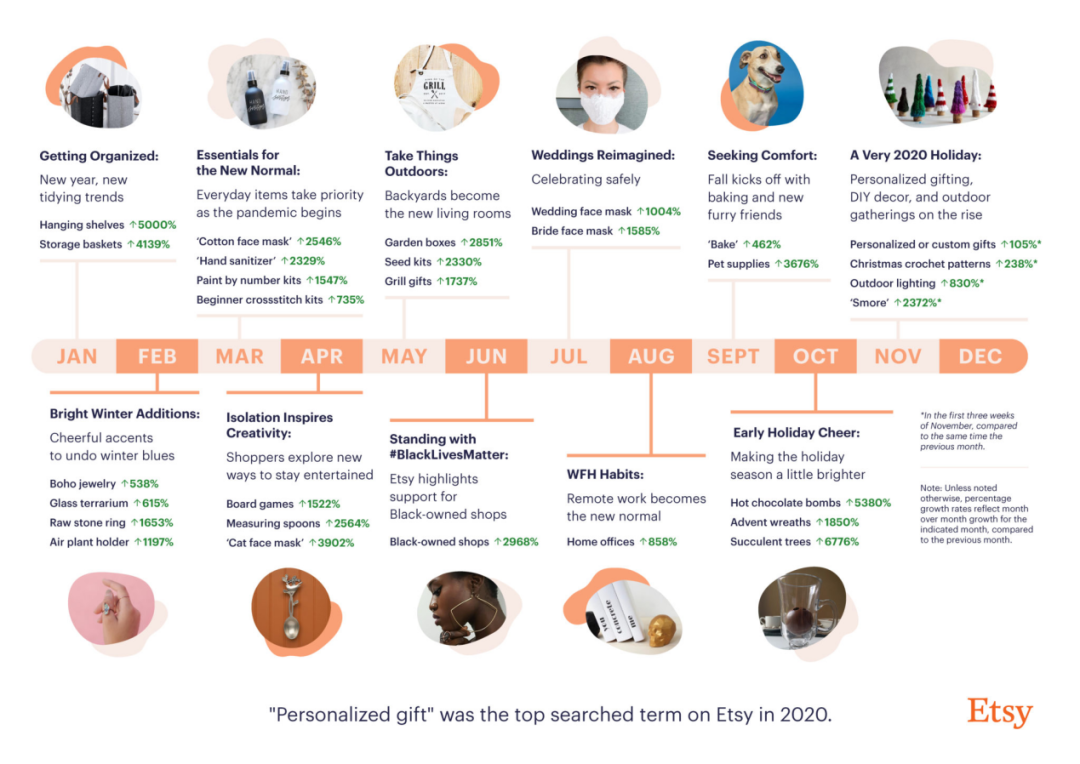 2020 年 12 月份,Etsy 官方发表的博文中,从关键词搜索量的角度总结了 2020 年平台中每个月份受欢迎的商品品类。