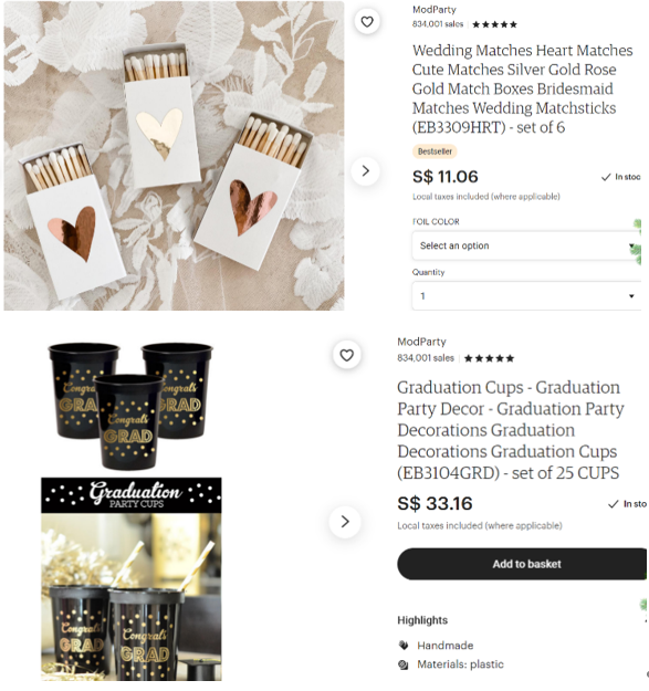 比如 ModParty 的 Wedding Favors 专区中,卖得很好的商品有婚礼上用的火柴、婚礼上用的蜡烛等;在 Graduation 专区,还卖有毕业元素的气球、水杯等。虽然都是小物件,但都有一定的设计感。而这个卖家在分类时,也是按照这些有仪式感的场景去做划分的。