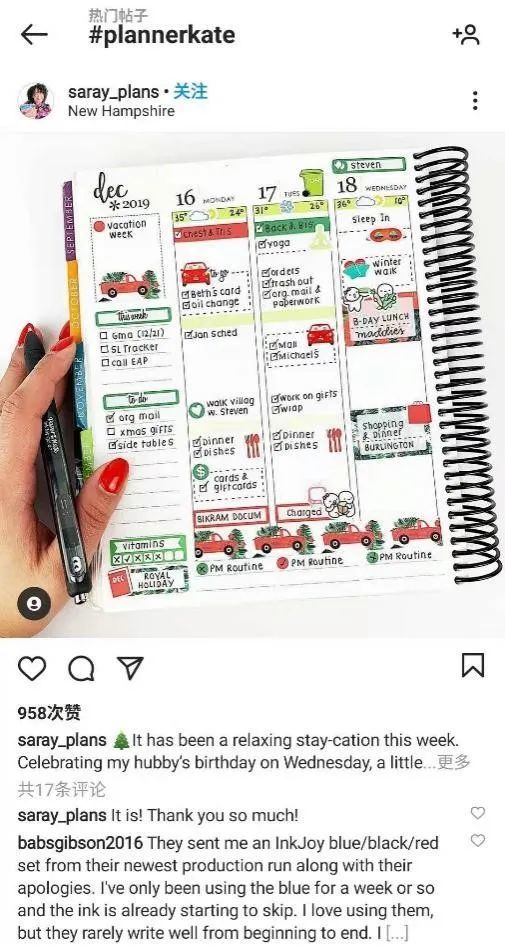 据笔者了解,海外很多消费者买贴纸的目的是用来做手帐。手帐在海外的女性消费者中有着较高的接受度,Instagram 上,也有很多展示手帐照片的博主有着大量粉丝。而 PlannerKate1 的贴纸由于样式丰富,色彩选择多,也很适合用户拍照并上传到社交平台上。在 Instagram 的 PlannerKate 的标签话题下,也有很多消费者晒出自己将贴纸贴到本子上后的效果。