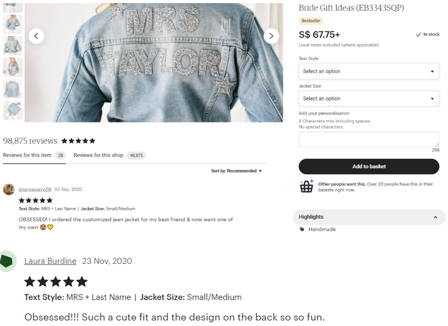 另外 Top10 卖家中有一个叫 ModParty 的卖家,它出售的商品有个性化定制的牛仔外套、杯子等,消费者可以把自己的名字设计在商品上,从商品评论也可以看出消费者对这种个性化的设计非常买账。