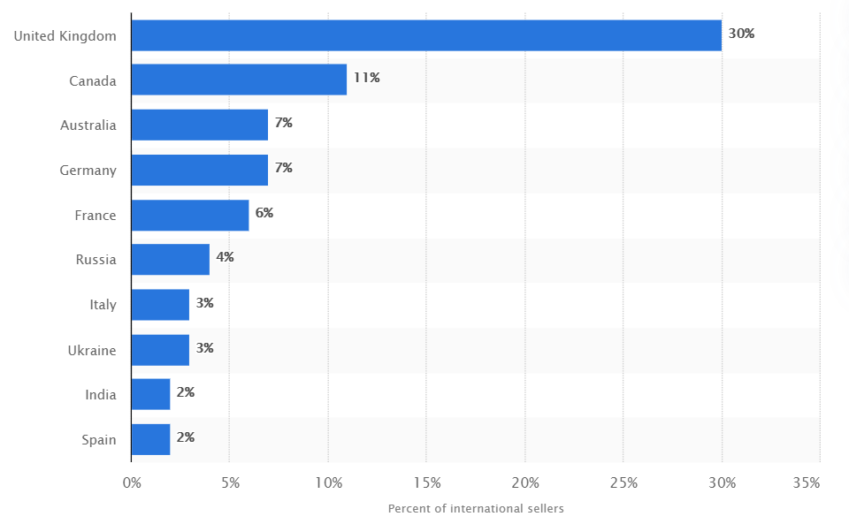 目前 Etsy 是一个还没有大量中国跨境卖家入驻的平台。根据 AMZ123 的数据,亚马逊 Top2000 热销商品背后的卖家中,中国卖家数量占比 59.3%,形成对比的是,Etsy 平台上有 62% 的卖家来自美国,而 Statista 的数据显示,除美国以外,Etsy 卖家数量 Top10 的国家里甚至也没有中国。
