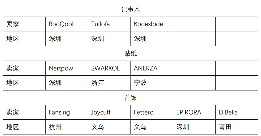 其实,Etsy 上最热门的 3 类产品分别是记事本、贴纸、首饰,而在亚马逊上相应品类下的 Top10 热销商品中,背后有不少中国商家。