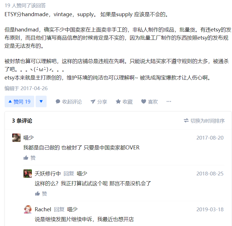 其次,根据跨境知道的报道,其实前几年也有很多中国卖家入驻 Etsy,但是他们当中有些卖家以卖手工制品的名义去做铺货模式的业务,为了维持平台定位,Etsy 对平台内手工制品的真实性的审查格外严格,这也造成了大量中国卖家被封店。而且由于中国卖家曾经出过问题,所以直到现在那些做手工制品的卖家还是会受到“特殊关照”。比如知乎上有网友表示自己 Etsy 店铺中的商品明明都是手工的,但是也被封店。