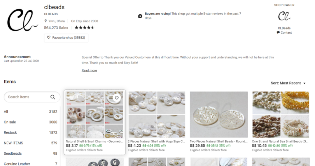 但其实 Etsy 平台上不只有手工品和复古品,也有铺货型卖家的非手工商品。只要不虚假地为店铺中的商品打上“手工品”的标签,中国的铺货型卖家也可以在平台中取得不错的成绩。比如有一个来自浙江义乌的叫 Clbeads 的卖家,2008 年就开始在 Etsy 上做生意,主要卖首饰。它的商品都没有被打上“手工品”的标签,但是它 2020 年的销量也进入了平台的 Top10,也是 Top10 中唯一一家中国卖家。另外,2020 年销量 Top10 的卖家中,有 8 家的商品都不是手工品,这也反映出,即使作为以手工品为特色的平台,但这并不是成绩好坏的绝对评判标准。