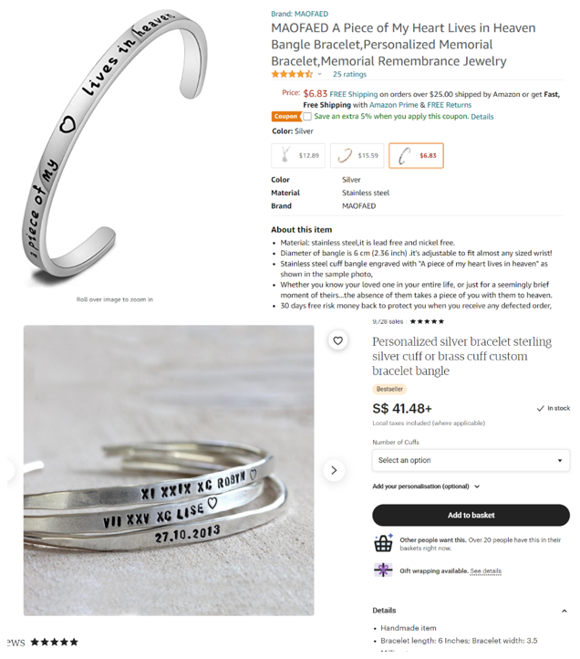 比如笔者看到同样两款以银为材质的手镯,款式也类似,亚马逊上只卖 6.83 美元,而 Etsy 上卖 41.48 美元。而且 Etsy 的那款共有 200+ 条评论,亚马逊的那款只有 25 条,也能侧面反映出 Etsy 的手工品即使定价更高也有较高的销量。