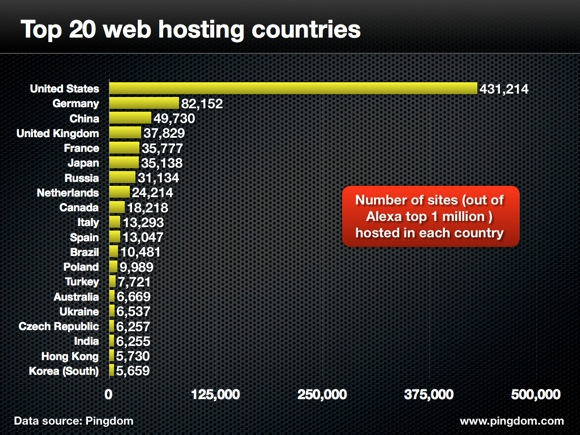 从网站域名的维度去看网站的归属地,美国有近 1 亿的网站。