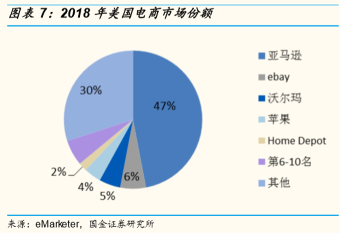 . 美国前 10 名电商网站的市场份额占 70%,11 名开外的所有电商网站占 30%,市场集中度相对低。