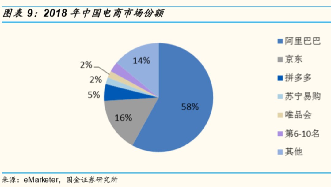 这是 2018 年的中美电商市场份额的数据,反映的情况还是很明显的: