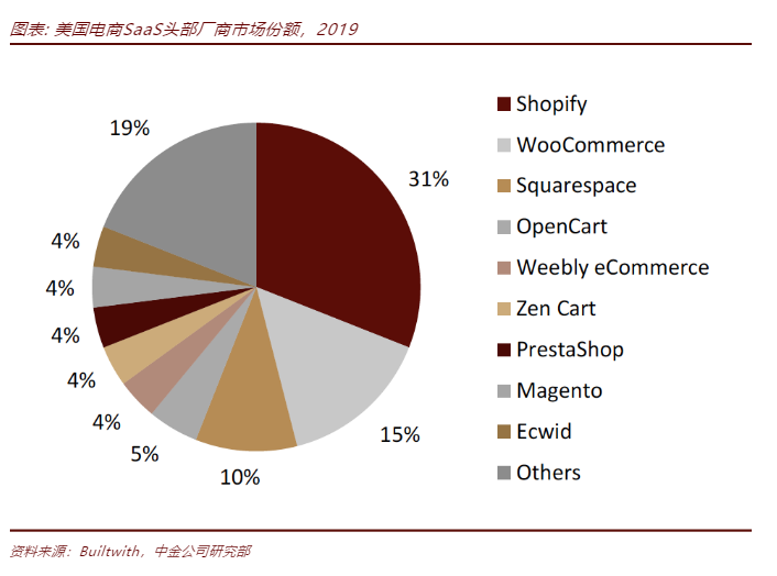 全球大概有 50 万活跃的商户在使用 Shopify 建站并售卖商品,2019 年总计产生了 611 亿美金的 GMV。Shopify 在建站工具里的市场占有率是 31%,俨然成为了一个小地主。