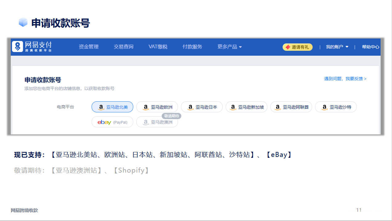 网易跨境收款,网易官方全球跨境收款平台,支持亚马逊Amazon、eBay、PayPal等跨境电商平台收款。境内外全牌照保障您的资金安全,提现快速到账、0汇损。